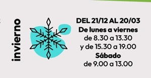 Invierno (Del 21 de Diciembre al 20 de Marzo): De lunes a viernes: de 8,30 h. a 13,30 h. y de 15:30 h. a 19,00 h. Sábados de 9:00 h. a 13:00 h.