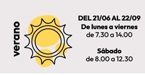 Verano (Del 21 de Junio al 22 de Septiembre): De lunes a viernes: de 7,30 h. a 14,00 h. Sábados de 8,00 h. a 12,30 h.