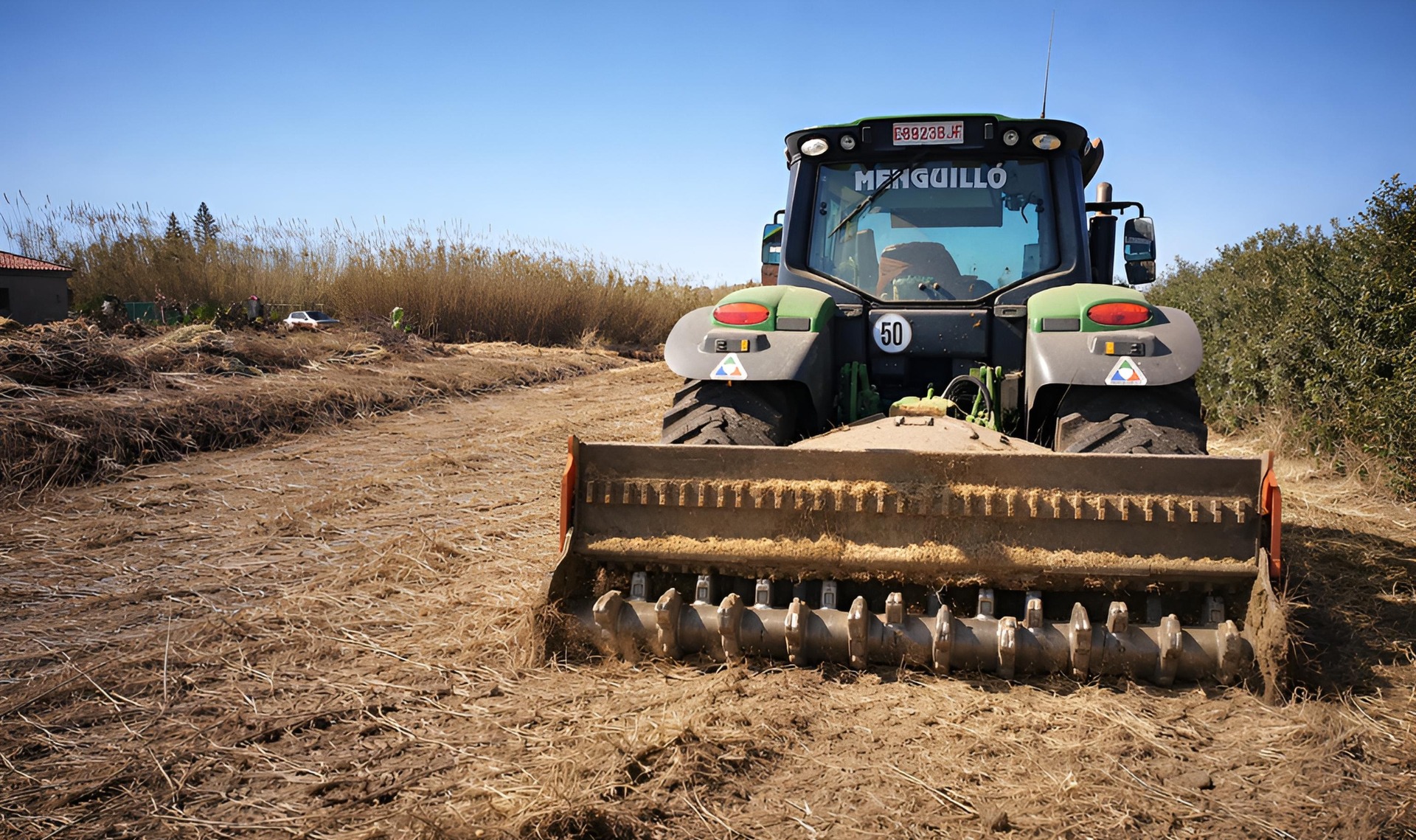 Cada día más fincas se abandonan, pero Grupo Menguillo recupera tu terreno. Con maquinaria avanzada, trituran restos vegetales y maleza, dejando la superficie limpia como en la foto.
