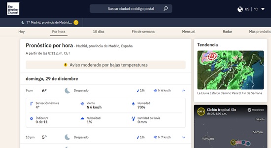Weather.com ofrece pronósticos del tiempo globales, alertas meteorológicas, mapas interactivos y pronósticos por hora, día y semana, adaptados para viajeros de todo el mundo.