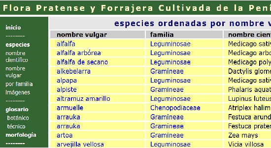 La web ofrece una lista de especies de flora con sus nombres vulgares, científicos y familiares, enfocada en plantas pratenses y forrajeras cultivadas en la Península Ibérica.