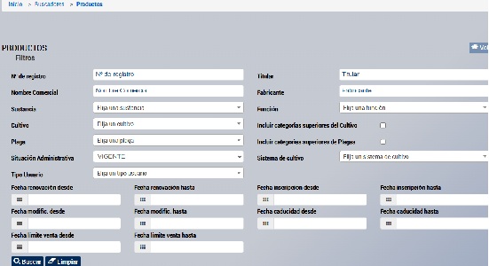 Web sobre fitosanitarios, con 4 menús de búsqueda: nº de registro, nombre comercial, sustancia activa, cultivo y cultivo/plaga. Si no lo encuentra, consulte otras denominaciones.
