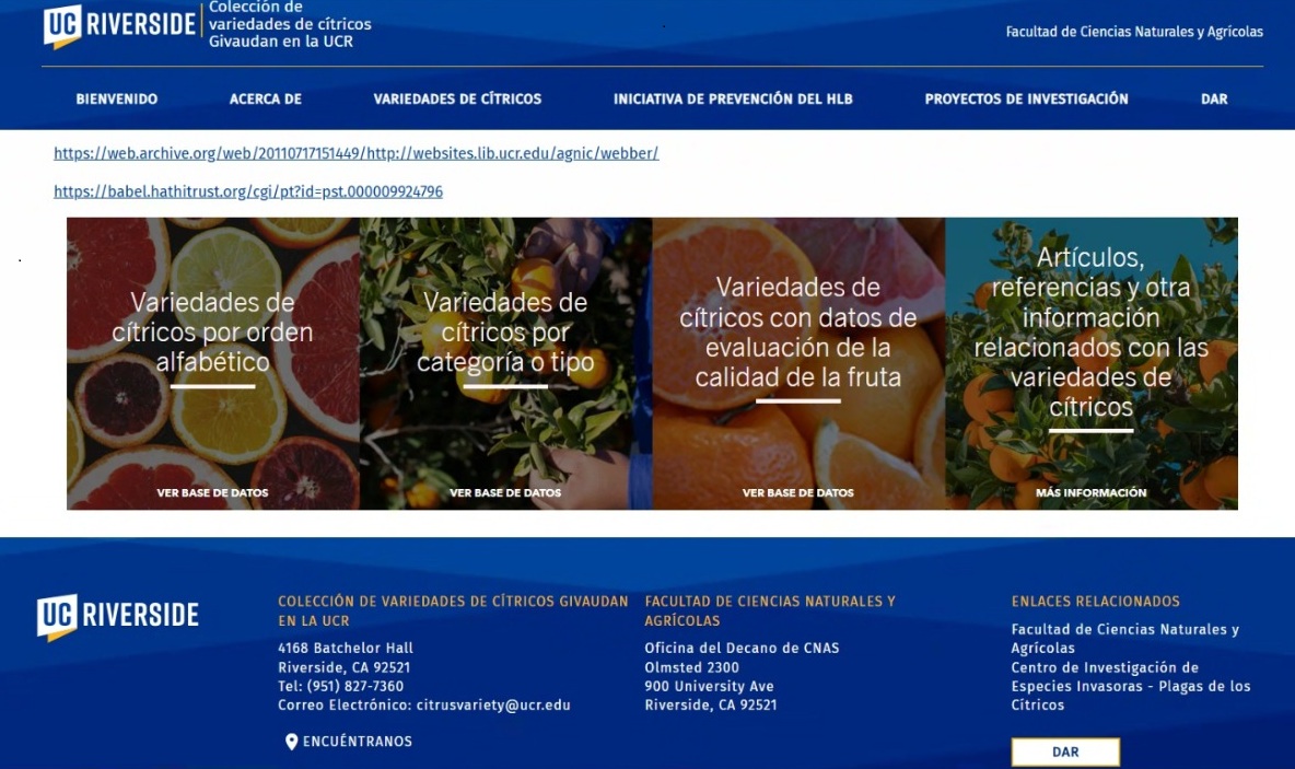 La Universidad de California Riverside alberga una de las colecciones de cítricos más importantes del mundo, con más de 1.000 variedades. No distribuyen yemas. Desde hace más de un siglo, apoyan la investigación agrícola y el desarrollo citrícola internacional.
